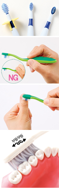 펜을 잡듯이 칫솔을 가볍게 쥐는 것이 좋다. 이렇게 하면 쓸데없이 힘을 들이지 않고 칫솔모의 끝을 세밀하게 움직일 수 있다. 평소 양치질할 때처럼 칫솔을 쥐고 아이의 이를 닦아주다 보면 강한 힘이 들어가 아이가 아파하고, 이에 붙은 음식 찌꺼기는 잘 떨어지지 않는다.