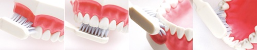 1_ 앞니의 안쪽과 평행하게 칫솔을 넣고 칫솔모의 끝을 치아와 잇몸 사이의 경계에 갖다 댄다.