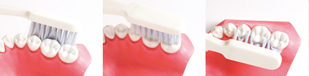 치아 사이에 칫솔모의 끝이 닿도록 칫솔을 기울여 움직인다. 몇 번 연습해보면 방법을 터득할 수 있다. 칫솔모의 끝을 치아에 대고 좌우로 크게 움직이는 것이 아니라 칫솔모의 끝을 대고 미세하게 진동하듯 움직이며 찌꺼기를 닦아낸다.