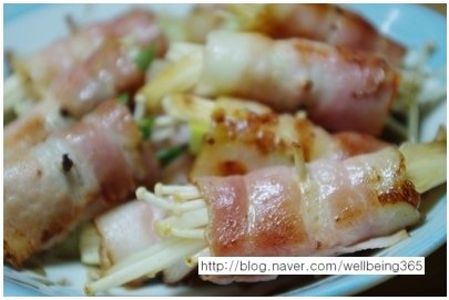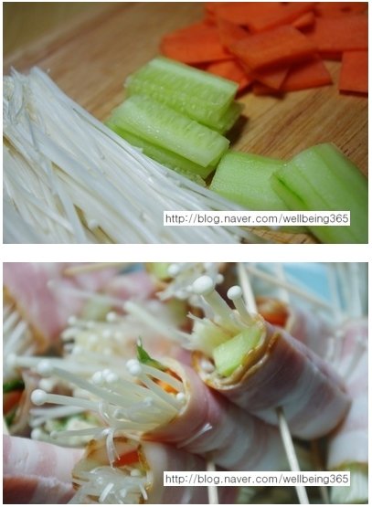 베이컨으로 돌돌 말아 이쑤시개로 고정시켜줍니다
