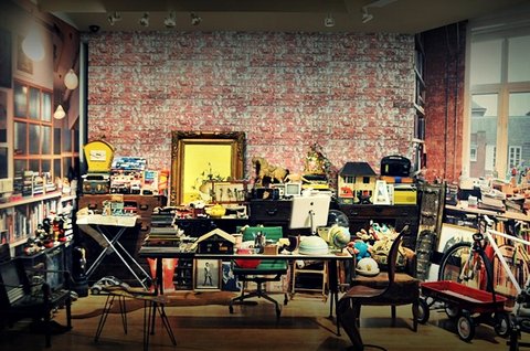 상상할 수 있는 모든 오브제들이 한데 섞여 선반과 탁자 위, 의자