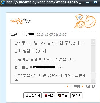 " 니 홈피에 누가 지갑 줏어 놨단다 확인해바라 "