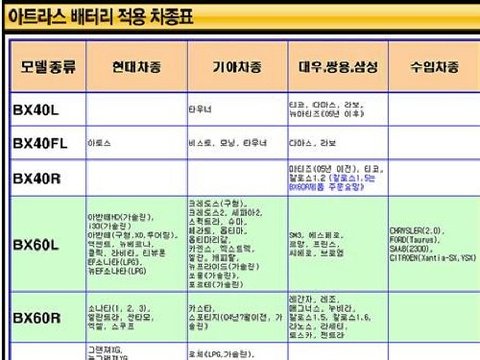 위 표는 모 배터리 제조사의 제품 호환표입니다. 판매샵에서 바로 확인할 수 있으며 국내에서 팔린 차량들은 대부분 표시되어 있기 때문에 이에 맞춰서 구입하면 됩니다.