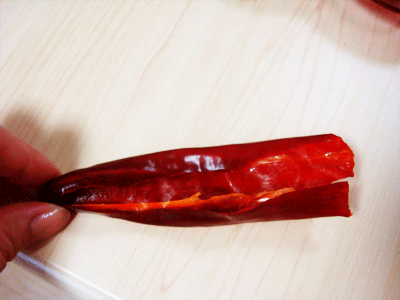 홍고추 꼭지를 잘라서 씨를 다 제거합니다.