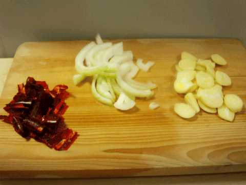 다듬은 재료들인 양파, 마늘, 홍고추를 넣습니다.
