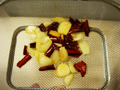 볶았으면 기름과 마늘,양파,홍고추를 기름에서 걸러서 꺼내세요.
