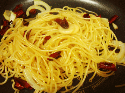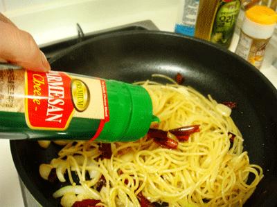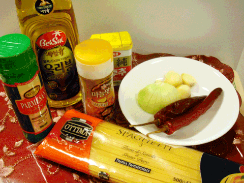 파마산치즈가루, 올리브유, 소금, 후추, 양파1/4, 마늘3개, 홍고추2개, 파스타면.