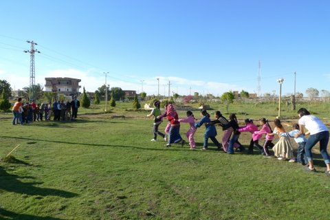 꼬리잡기 중. 남녀가 서로 몸을 만질수 없기에 앞 뒤는 코이카단원들이 서야했었음.