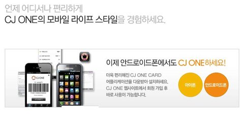 CJ one어플은 앱스토어, 티스토어, 안드로이드마켓 등에서 무료로 다운 받아 사용합니다.