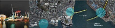 <부산항빛축제 전시물 설치장소, 부산항 앞바다 각각 세 곳에 빛 전시물들이 전시될 예정입니다. >