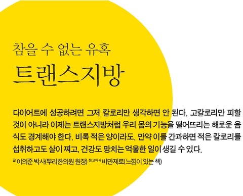 트랜스지방은 불포화지방산인 식물성기름이 상하는 것을 막기 위해 수소를 집어넣는 과정에서 발생하는 지방산으로, 자연 상태에서는 거의 존재하지 않는 기형지방이다. 실제로 트랜스지방이 함유된 라면, 피자, 햄버거, 치킨, 과자, 빵, 튀김 등을 과다하게 섭취하면 동맥경화, 심장병, 뇌졸중, 대장암, 전립선암, 난소암, 유방암, 고지혈증, 당뇨병 등이 올 수 있고, 뇌세포 손상, 만성 피부질환의 원인이 될 수도 있다. 특히 트랜스지방은 현대인들을 살찌우는 주범으로 지목될 만큼 다이어트의 적이다. 지방 함량이 많고 나쁜 콜레스테롤 수치를 빠르게 높이는 데다 전체 칼로리 섭취량을 줄여도 복부비만을 증가시키는 것으로 알려져 있다.