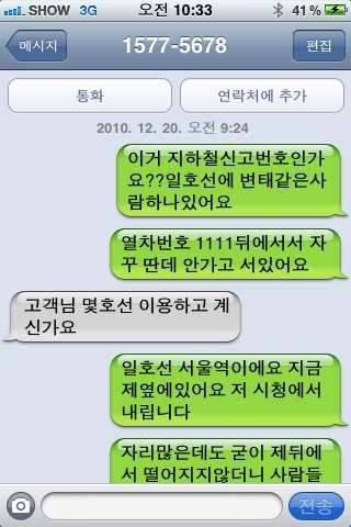 다음에 그런일 또 있으면 112로 신고문자를 보내란다...1호선사람들이...ㅡ.ㅡ