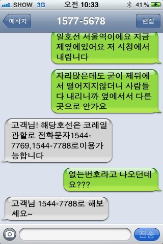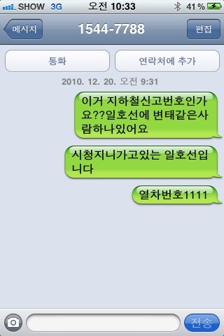 그래서 또 다른번호 (5678호선쪽에서 알려준 1호선 신고번호)ㅡㅡ로 문자를 보냈다.