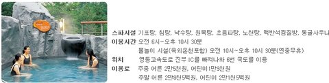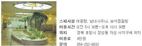 벽면이 유리로 되어 있어 바깥 경치가 훤히 내다보이는데, 포항시내의 야경이 특히 아름답다. 남녀 사우나와 찜질방 등 온천 시설 외에도 스포츠 마사지실과 피부미용실 등 부대시설을 고루 갖추었다.