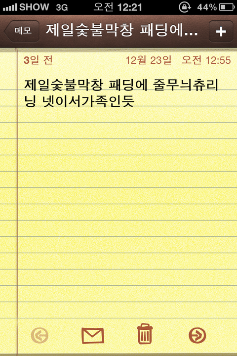 게다가 부모님과 같이 있으시길래 실패했습니다. 그래서 소주를 계속 들이키며 아쉬움을 달래며 언제 또 볼까... 슬퍼하며 나오는 찰나, 혹시나해서 얼른 메모에다가 저렇게 입력하게 되었습니다.