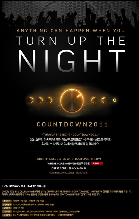 밀러의 TURN UP THE NIGHT 3번째 파티인 COUNTDOWN2011 파티가 청담동 클럽 엔서에서 열립니다!