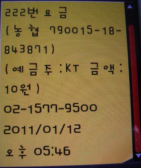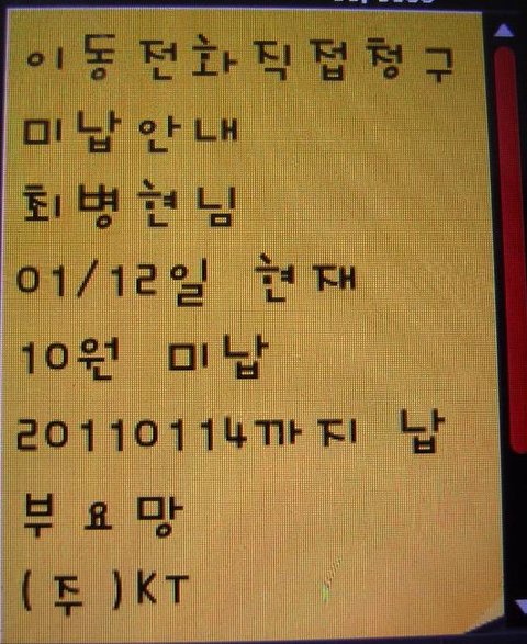 그러자 KT담당자 왈 고객님 예전 쓰던 전화기가 KT전화기가 아니라서 그런 문제가 발생한게 아니냐구 하는겁니다 그러나 과장님께서는 2년여동안 KT번호 그대로 계속 사용중이셨고 요금도 자동이체로 계속 빠져 나가고 있었습니다 그러자 KT담당자가 했던말입니다 아 저희측 문자 실수 입니다 잘못 발송된거 같네요 돈 안내셔도 됩니다..........