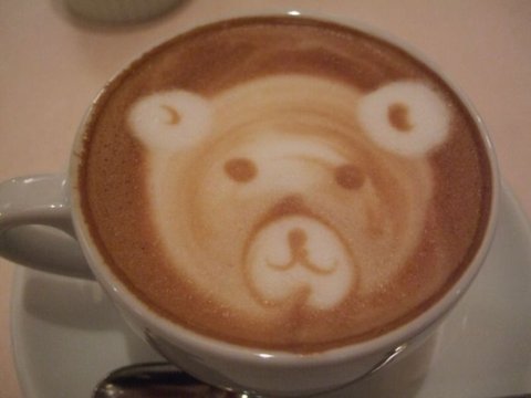커피잔에 커피를 담고 위에 곰 얼굴모양을 생크림으로 그려낸