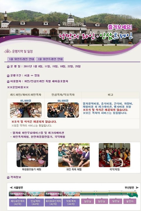 열차 내에서 와인시음과 와인족욕체험, 천연화장품만들기, 각종 레크레이션에 와인강의까지 들을 수 있다.
