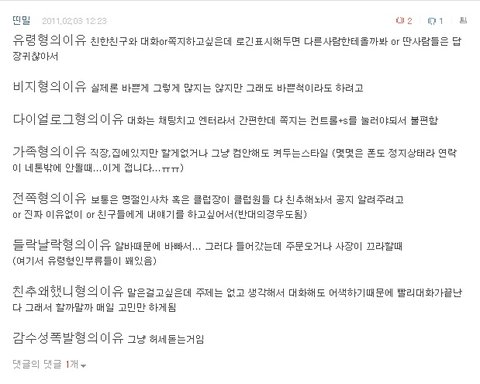 +) 그리구 3번 다이얼로그형? 글에서 기분나빠하시는 분들 조금 있던데..ㅠㅠ 비하하려는 의도로 쓴건 아니였구요.. 그냥 재미있으라고 쓴거였는데 그렇게 보였나 보네요ㅠㅠ 모든 유형들 모두 다 비하하려고 쓴게 아니고 그냥 그런친구들이 많길래 쓴거랍니다..ㅠㅠ 기분 나쁘셨다면 죄송합니다..