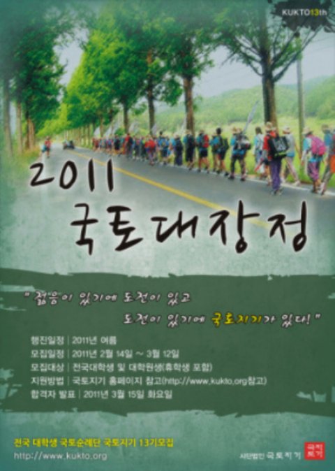 "젊음이 있기에 도전이 있고, 도전이 있기에 국토지기가 있다!" 모집일이 2월 14일 부터 시작 됩니다. :) 나는 톡은 처음 써보지만 요즘의 대세와 트렌드와 유행과 경향을 따라서 음슴체로 쓰겠음. 건방지다 말하지 말고 읽어 주셈. 읽어보고 궁금한거 있으면 내 방명록에다가 질문 날리셈. 이건 홍보용으로 홈페이지에다가 스크랩해 놓으라고 해서 쓴거임. 내가 2010년 여름에 국토대장정을 갔다왔는데 쪼끔만 소개를 해도 될까마시? 자년 이맘때 쯤에 나는 친한 친구한명과 필리핀여행을 다녀왔음. 근데 다녀오고 나니까 너무 아쉬워서 뭐라도 또하고 싶은거임. 그래서 싸이월드 파도타기를 하다가 위에 글 비슷한걸 보게됨. 국토지기 12기 모집하는 포스터랑 글이었음. 왠지 처음에는 별로 비호감이었음. 사람들이 꼬질꼬질한 얼굴로 웃고있는게 왠지 아프리카 난민구호활동 처럼 보였음. 근데 원래 번지점프랑 국토대장정은 살면서 한번은 꼭해보고 싶어서 친구랑 신청하기로함. 신청서를 써야하는데 다른사람들은 기본으로 3장은쓰고 사진도 올리고 했다고함. 근데 나는 술을 많이 먹은날에 피시방에서 갑자기 한거라 사진은 올릴수도 없었고 중요한건 소개도 5줄밖에 안썻음. "제가 국토대장정을 하지않으면 누가 하겠습니까" 뭐이딴거였음. 무슨 해병대 지원하는것도 아니고ㅋㅋㅋㅋㅋㅋㅋㅋㅋㅋㅋ 아무튼 3월에는 합격자 발표중에 예비정모를 각지역별로함. 나는 예비정모에 가서 씐나게 놀다가 잘논다고 발탁이 되었음. 영광스러운 이유임. 무튼 이래 저래 거두절미하고. 머릿말이 너무 길었음. 3월4월5월6월7월 한달에 한번씩 대전에서 예비 전체 정모를함. 나는 지나치게 솔직하니까 말해주자면 저거 다오라고는 하는데 몇번쯤은 안가도됨.ㅋㅋㅋㅋㅋㅋㅋㅋ 가는건 각지역별로 사람들끼리 모여서 보통 차를 렌트해서 가는거라서 그렇게 힘들진 않음. 그리고 무엇보다 가면 사람들끼리 2시간만에 친해져서 완전 재밌음. 그렇게 해서 7월쯤에 출발해서 한달동안 걷고 8월에 도착하는 일정임. 한달동안 핸드폰도 못사용하고 푹신한 이불같은건 없고 가끔씩 잘자고 있는데 텐트지붕이 날아가버리기도 하는데 가끔씩임. 걷다보면 진짜 힘들때도 있지만 적응이 빠른사람은 처음에 일주일만 힘들고 뒤에 3주는 완전 놀면서 걸음. 거의 대부분이 그렇게됨. 나같은 경우는 1주일동안 조금힘들다가 뒤에 3주는 거의 음주가무를 즐기는 행진이었음. 아놔 이거 딴사람이 알면 안되지만 나는 지나치게 솔직한 성격임.ㅋㅋㅋㅋㅋㅋㅋㅋㅋㅋㅋㅋㅋㅋㅋㅋ 아무튼 2010년 여름은 무더웠지만 120명과 함께한 나의 여름은 정말 다이나믹하고 평생잊혀 지지않을거임. 이글을 읽는 사람들도 돈주고도 못사는 경험을 함께 나누었으면 좋겠음. p.s. 13기로 들어온 사람중에 이 글을 읽은 사람이 있으면 아무한테나 물어보셈. 12기 김지훈이라고 하면 왠만한 사람은 다 알거임. 그럼뿅!!!!