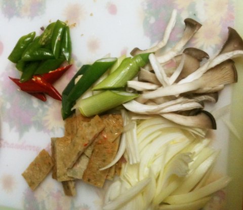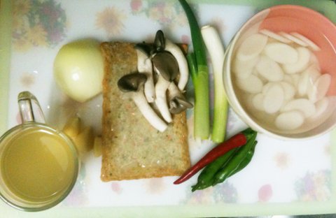버섯은 손으로 세갈래 정도로 찢어 주세요. 양파와 어묵은 먹기 좋은 크기로 썰어 줍니다.