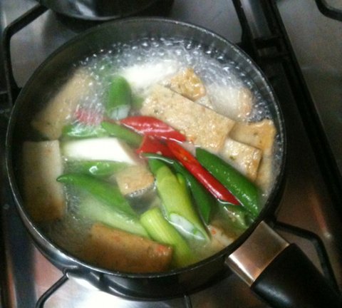 3.물이 끓으면 편으로 썬 마늘과 대파, 청양고추, 어묵을 넣고 어묵국물을 냅니다. 이때 국물이 우러나올 때까지 양념장을 만들어요.