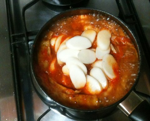 6.한소끔 더 끓어오르면 물에 담가두었던 떡을 떡만 건져서 끓고 있는 냄비에 넣습니다.
