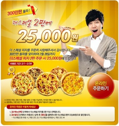 이게 바로 요즘 승기가 광고하고 있는 피자헛 더스페셜 피자입니다~빵끝이 맛있다며 승기가 빵 테두리만 잘라서 들고 있는 모습이 눈에 아른거리네요.ㅎㅎ 마침 요즘에 300만판 판매 돌파 기념으로 더스페셜 피자 두 판에 25,000원 하는 행사를 진행하고 있어서 부담 없이 주문했죠. 원래 15,900원 이니까 한 사람 분 이상은 절약한 셈이네요.