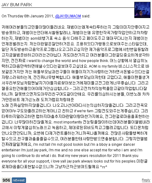 이를 안 재범은 트윗을 통해 팬들을 달랬다. 억울하다거나 남탓을 한다거나하는 트윗은 없었다.
