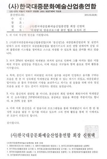 이어 “이는 문산연의 판단일 뿐 아니라 문산연의 회원 단체의 회원사이자 박재범의 전 소속사였던 JYP 측도 공감하고 있음을 확인한 부분이기도 합니다”라며 “귀 방송사 프로그램들을 통해 박재범이 다시 한번 왕성한 모습을 펼칠 수 있기를 바라고 있으며 그의 연예활동을 통해 귀사에도 큰 도움이 됐으면 합니다”라고 덧붙였다.