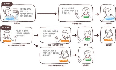 정보가 매우 빠른 속도로 넓게 퍼져나가는 인터넷 공간의 특성 상 네이버와 같은 인터넷 서비스 제공자는 요청을 받는 즉시 게시를 중지하도록 법에서 정하고 있습니다.