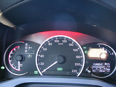 스포트 모드일 때의 계기판 모습입니다. 스포트로 모드를 변경하면 계기판 색상이 빨간색으로 변하고 타코미터가 나타납니다. 타코미터가 있는 토요타 하이브리드는 CT200h이 두 번째입니다.
