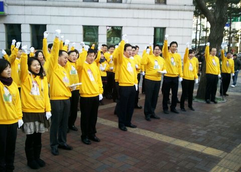 노란옷 맞춰 입은 사람들이 힘내라며 반갑게 인사를 하고 있더라구요!