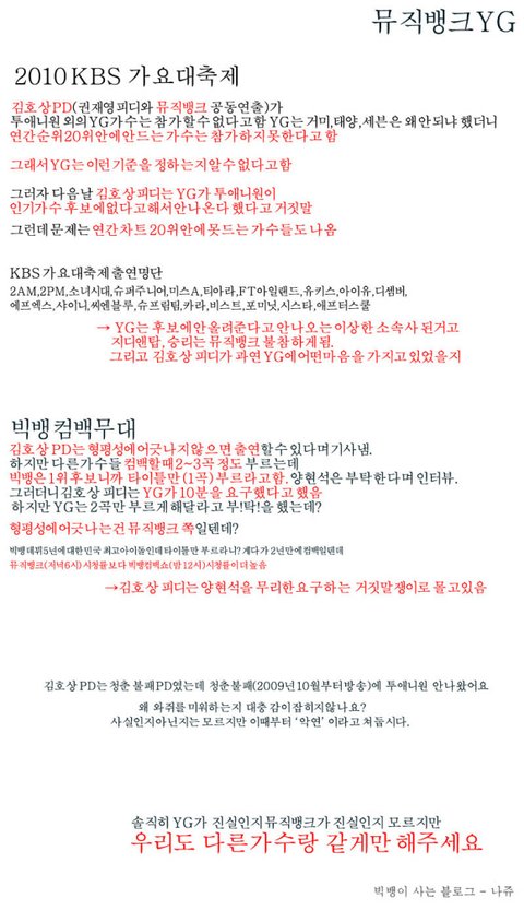 그리고 KBS 연말 가요대축제가 열리는 날, 김호상PD님께서는 인터뷰에서는 양현석 사장님께서 연말에 시상하는 최고 인기가수후보에 2NE1이 없으니 YG가수 분들이 나오기 싫다고 했다는 거짓말을 하시고 말도안되는 언론플레이를 하시면서 YG를 사실과는 다른 말도 안되는 기획사로 만드셨습니다.