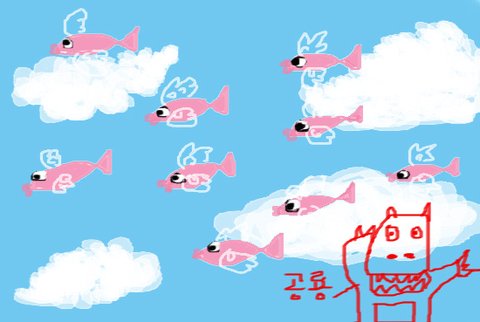 하늘을 나는 물고기에요... 근데 하늘인지 모르실까봐 구름도 그렸어요ㅎㅎ...
