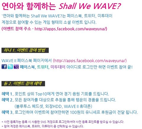 재밌는 이벤트들이많이있네요 ^^* http://apps.facebook.com/waveyuna 여기 주소에서 확인해보세요~