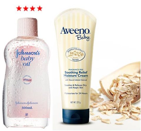 존슨즈 베이비 미네랄 바디오일(좌), 아비노베이비 수딩 릴리프 모이스춰 크림(우)