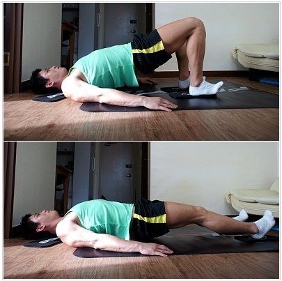 누워 양 발을 몸쪽으로 당겨 엉덩이가 바닥에서 떨어진게 한다.