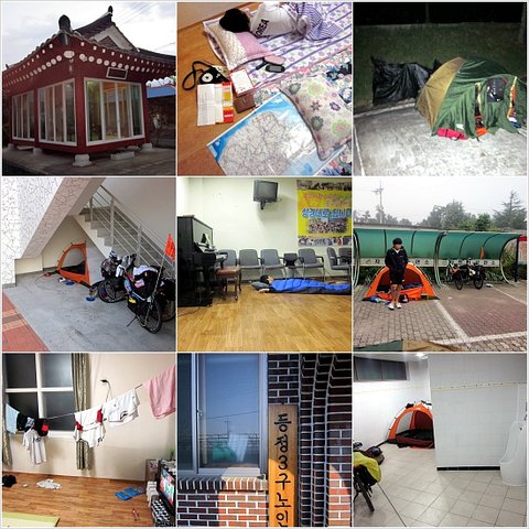 그리고 이런데 저런데서 많이 자구요 (텐트, 민박, 모텔, 찜질방, 노인정, 마을회관, 교회, 화장실까지)