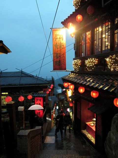 과거 금광으로 부자가 된 이들을 위한 술집과 식당, 보석상점들과 찻집들로 번성을 누린 지우펀은 국민당과 장제스가 타이완에 입성하기 전까지는 타이페이보다 더한 전성기를 누렸다고 한다. 온갖 음식들과 비냄새가 섞이며 비릿한 냄새를 풍기는 골목을 지나 100m쯤 더 올라가니 전망대가 보이고 흐린 가운데 저 멀리 바다와 몇몇 섬들이 눈에 띄었다.