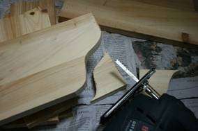 2) 모양을 대고 그린 목재를 직소기로 자른다