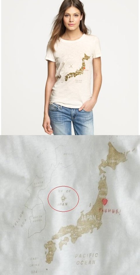 I visited jcrew.com recently and was surprised to find the way you incorrectly labelled Korea's 'East Sea' as 'Sea of Japan' on the Japan Love t-shirt. Such an error in a well known company as yours comes as a surprise. Using a proper name for the body of water between the Korean peninsula and the Japanese archipelago is not simply a question of changing the name of a geographical feature. Once Korea and Japan agree on a common designation, which is in accord with the general rule of international cartography, we can then follow the agreed-on designation. I will appreciate your explanation about this mislabel, and please reprint the t-shirts after fixing the label into 'East Sea' or 'East Sea/Sea of Japan.