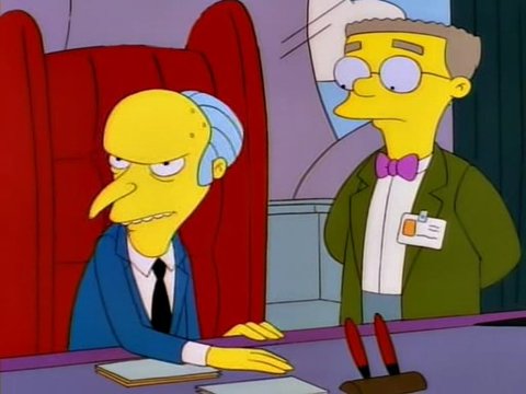 화면 왼쪽이 원전 사장인 번스, 오른쪽이 비서인 스미더스야.