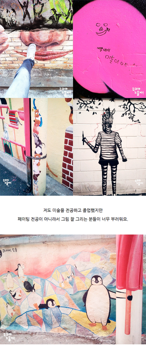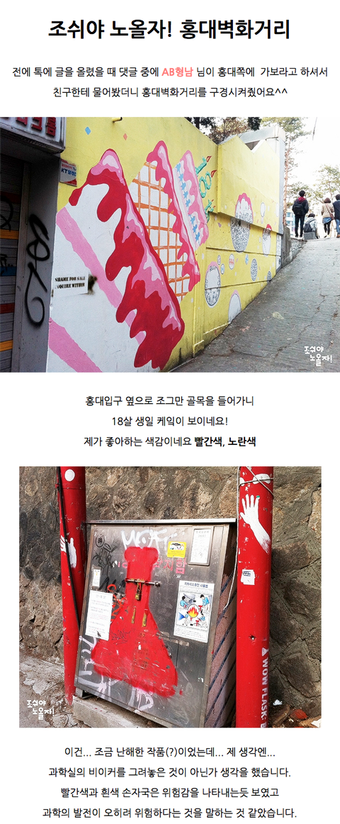 안녕하세요. 저 벽화는 대부분 홍대거리미술전에서 주최해서 홍대 앞 거리를 예술의 공간으로 만들어 놓은 겁니다. 여러분! 저희 홍대 거리 미술전 많이 알아주세요~! 올해에도 어김없이 찾아옵니다!! 올해가 벌써 19회째인데 홍보가 잘 되지 않아 사람들이 잘 모르더군요!! 저는 현재 홍대 거리 미술전에서 공연 팀장을 맡고 있습니다. 올해 9월 말 5일간 홍대 거리미술전을 개최하기 위하여 현재 기획중이구요, 오시면 저희가 꾸민 벽화, 전시, 공연, 참여미술을 경험하실수 있으세요~! 입장료? 없습니다. 물건 파는거 아니냐구요? 아닙니다. 저희는 홍대 앞 거리를 대중들에게 예술의 거리로 어필하고자 대학생들이 모여 기획하는 사람들이구요 모두들 홍대거리미술전을 알수 있도록 추천좀 해주세요~!! 부탁드립니다. 올해 9월 말 제19회 홍대 앞 거리 미술전이 열립니다. 모두 관심 많이 가져주시고, 따분하고 가기 어려운 미술전, 공연 꼭 오셔서 다같이 참여도 하고 공연도 공짜로 보고, 젊음의 거리 홍대, 예술의 거리 홍대를 만끽해요!! ------------------------------------------------------------------------------------ 추천해주신 여러분 감사합니다! 정확한 날짜는 지금 협의중이긴 하지만 예정은 9월 25일부터 시작할 예정이네요 ㅎ 많은 관심 부탁드려요~!!! 댓글에 함지은 단장님이 써주셨지만 한번 더 쏴드립니다 ㅎㅎ 아래 주소로 가시면 됩니다!! artistgumiya.cyworld.com