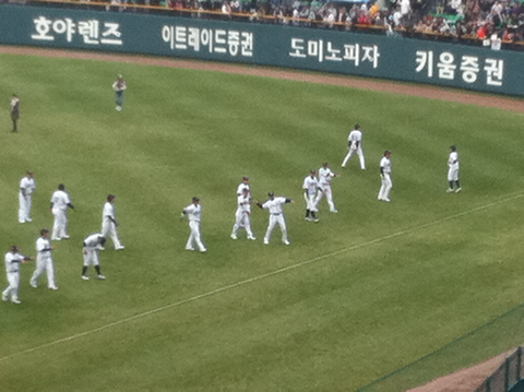 4시 40분때부터인가? 몸풀기 시작함 오재원선수 나옴