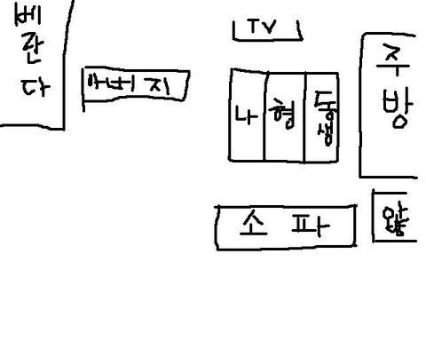 우리 아버지는 더위랑 추위를 많이타셔서 여름엔 방이 답답하다고 매일 거실에서 주무셔. 중요하진 않지만 우리집 구조와 잠자리를 그림으로 설명해줄게.