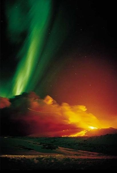 화산폭발과 오로라의 모습을 동시에 볼수있는 매우 희귀한 사진입니다.