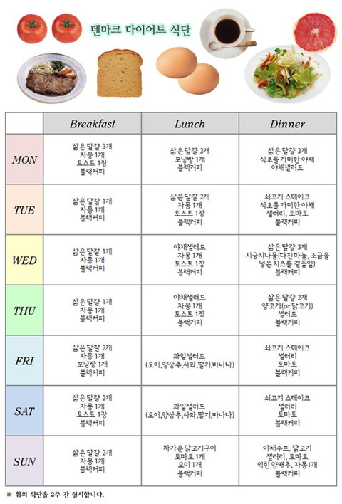 아래의 덴마크 다이어트 식단표를 참고하세요.
