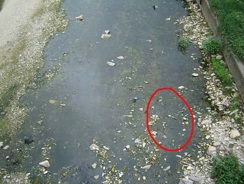 개천 한가운데에 이상한 형체가 수면 위로 둥실 떠 있었습니다